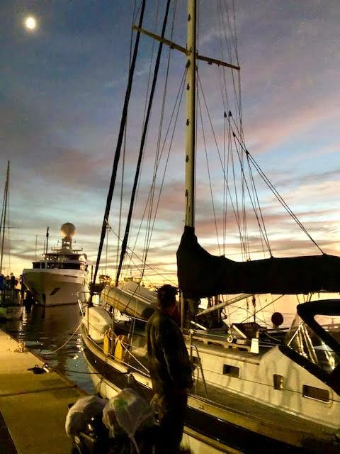 Joe and I descended to begin making the coffee we now needed to steady our nerves and the skipper called again. He thought he owed us money; he saw scratches on our sheer stripe, sauntering over a wad of cash in hand. Again, we went forward to examine. The scratches wiped right off, no money needed. Again, we parted. Our faith in people, in this community, affirmed, we breathed deeply. Glad to be alive. Happy to sip some coffee, eat oatmeal with fresh blueberries and chat with my mom on our latest no-progress travel.