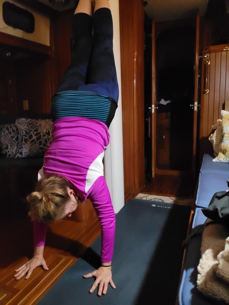 But hey- the sun WAS shining and I was feeling better after the previous day’s malaise that had gripped me. Thinking about hot coffee and how best to cheer Joe through Day #10 of bilge diving and yoga practice( in other words: engine repair), I stirred. I also heard bow thrusters disturbingly close on this high-wind morning. I moved quickly to a vertical position.